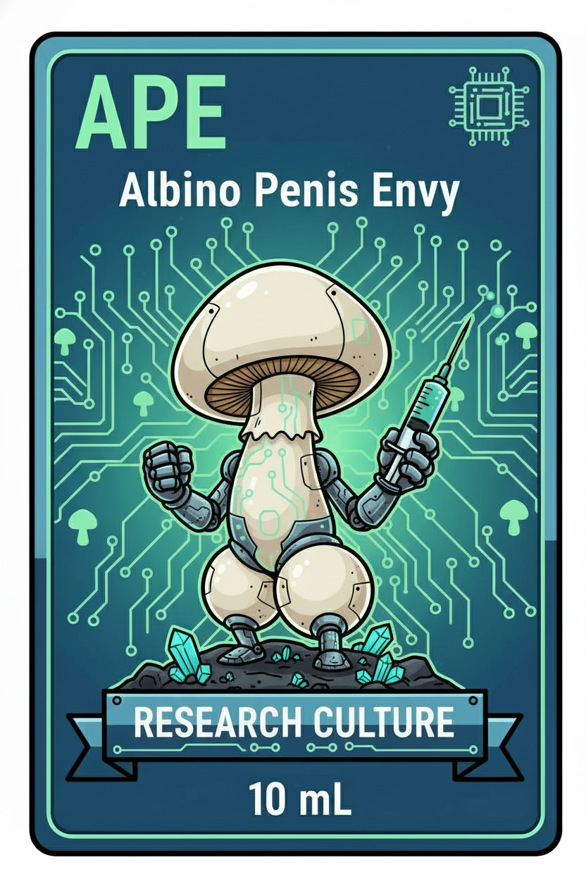 The Albino Penis Envy (APE) research strain is one of the most structurally unique and visually dense specimens in microscopy. Known for its compact, tight-knit hyphal formations, APE exhibits thick cellular structures, pronounced branching nodes, and highly concentrated growth zones that stand out dramatically under magnification.